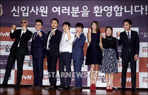 ソウル・汝矣島の63コンベンションセンターで15日午後、バラエティー番組『今日から出勤』(tvN)の制作発表会が行われた。写真は、フォトセッションでポーズを取るgodのパク・チュニョン、タレントのキム・ソンジュ、歌手のJKキム・ドンウク、ウン・ジウォン、タレントのホン・ジノ、モデルのイ・ヒョニ、JEWELRYのイェウォン、歌手のロイ・キム(左から)。