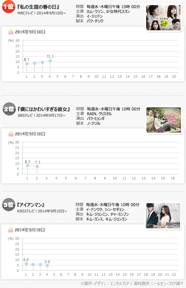 視聴率:『私の生涯の春の日』11.1%『私の生涯の春の日』(MBC)が視聴率2ケタ台で水木ドラマのうち1位の座をキープしている。 18日夜に放送された『私の生涯の春の日』の全国視聴率は11.1%(19日、ニールセン・コリア調べ、以下同じ)で、前回放送分(9.5%)に比べ1.6%増。同時間帯に放送された水木ドラマの中で最も高い視聴率を記録した。 なお、同時間帯に放送された『僕にはかわいすぎる彼女』(SBS)は7.5%、『アイアンマン』(KBS第2)は5.0%だった。 朝鮮日報日本語版