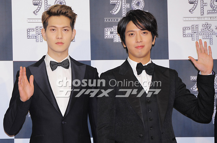 ファンの声援に笑顔のCNBLUE 26日午後、ソウル・汝矣島のKBSホールで「2014 KBS歌謡大祝祭」が開催された。写真は人気バンドCNBLUE。おそろいの黒スーツにちょうネクタイ、満面の笑顔でファンの声援に応えた。 イ・デドク記者 朝鮮日報日本語版
