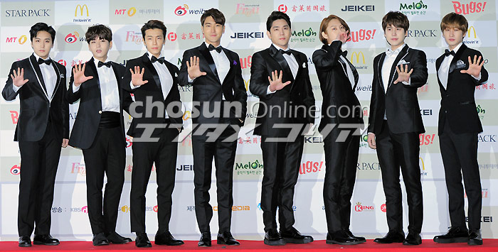 SUPER JUNIOR、そろってポーズ=K-POPアワード ソウル・オリンピック公園体操競技場(ソウル市松坡区)で28日午後、「第4回gaonチャートK-POPアワード」レッドカーペットイベントが行われ、人気グループSUPER JUNIORが出席した。 イ・デドク記者 朝鮮日報日本語版