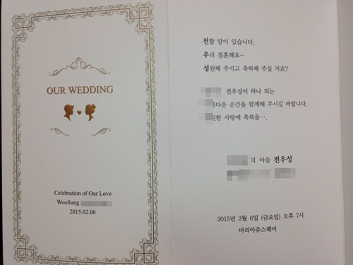 スターニュースが31日入手した招待状は白地のカードで、結婚式の日取りと場所が記載されている。招待状でチョン・ウソンとお相手の女性は、名前を用いたセンスあふれる三行詩で招待客に対するメッセージを伝え、目を引いた。 2人は「お伝えすることがたくさんあります。私たち結婚します。応援し、祝福してくれますよね? 美しい瞬間をぜひ一緒に過ごしてください。永遠の愛に祝福を」とした。