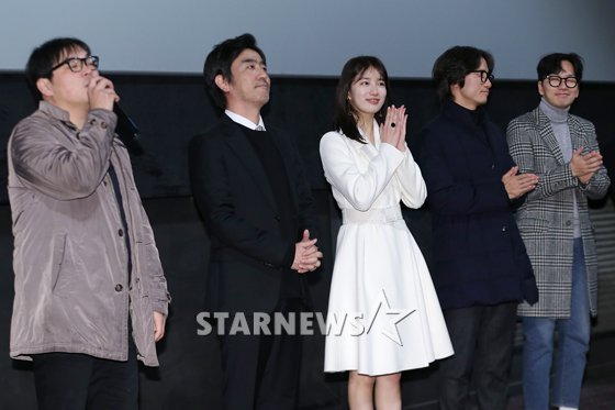 missAスジ主演『桃李花歌』舞台あいさつ ソウル市城東区の映画館「CGV往十里」で28日午後、映画『桃李花歌』の舞台あいさつが行われ、イ・ジョンピル監督、リュ・スンリョン、missAのスジ、ソン・セビョク、イ・ドンフィ(左から)が出席した。 パク・チャンハ記者 STARNEWS/朝鮮日報日本語版
