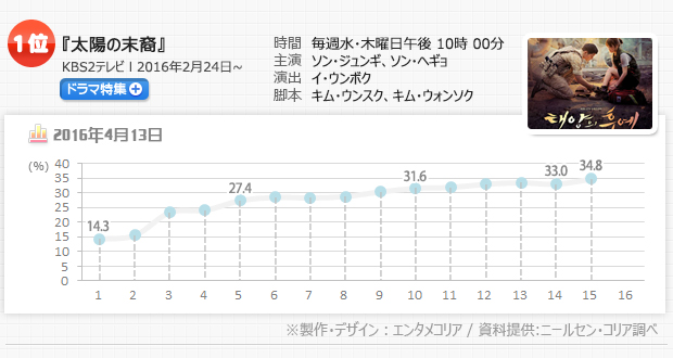 13日に放送された『太陽の末裔』の全国視聴率は34.8%(14日、ニールセン・コリア調べ、以下同じ)をマークした。