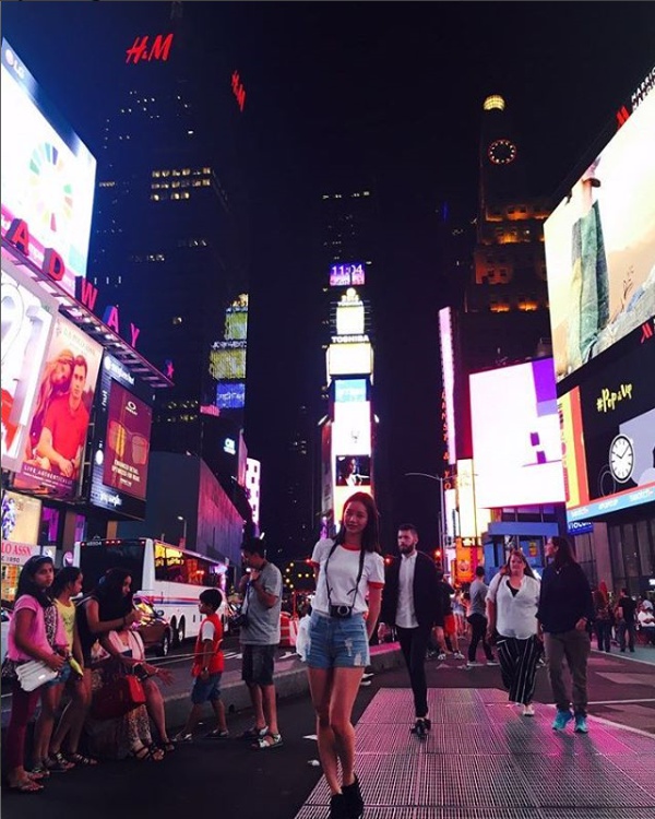 写真のヘリは白のTシャツにデニムのホットパンツというカジュアルスタイルで、キュートなポーズでカメラを見つめている。ヘリの美しさはニューヨークの夜景に映え、注目を集めている。