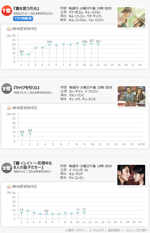 視聴率:『雲を思う月光』小幅ダウンも月火ドラマ1位 『雲を思う月光』(KBS第2)は数字を下げたものの、同時間帯の月火ドラマで視聴率1位の座を守った。 27日に放送された『雲を思う月光』の全国視聴率は20.1%(28日、ニールセン・コリア調べ)を記録した。 これは、26日放送分で出した20.7%に比べ0.6ポイントのダウンだ。 同時間帯に放送された『キャリアを引く女』(MBC)は8.4%、『麗<レイ>~花萌ゆる8人の皇子たち~』(SBS)は7.5%だった。26日にスタートした『キャリアを引く女』は第2話で同時間帯視聴率2位に浮上した。 朝鮮日報日本語版