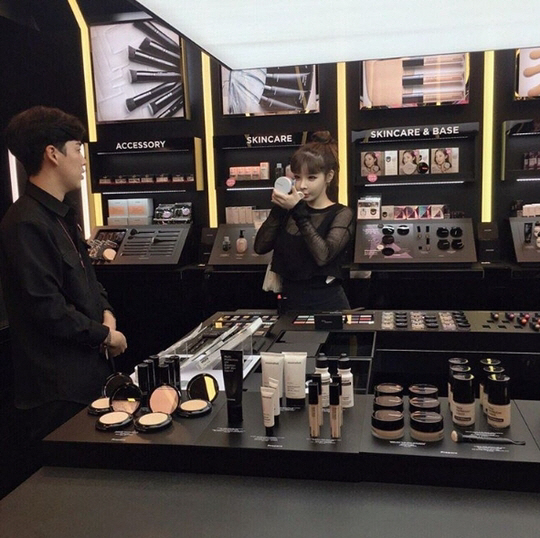 アップされたのは、ボムが化粧品店でメイクをしている様子の写真だ。