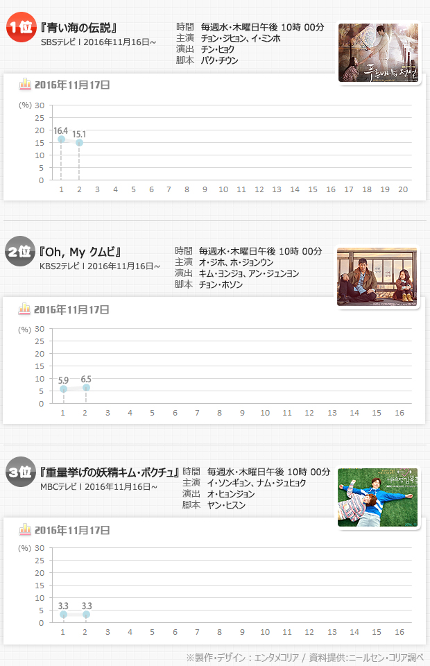 『青い海の伝説』と同時間帯に放送された『Oh, my クムビ』(KBS第2)は6.5%、『重量挙げの妖精 キム・ボクチュ』(MBC)は3.3%だった。