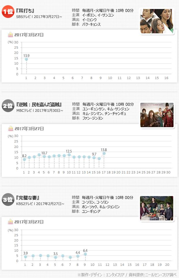 視聴率:『耳打ち』初回13.9%、月火ドラマ1位 SBSの月火ドラマ『耳打ち』が初回から月火ドラマ視聴率1位になり、順調なスタートを切った。 27日に放送された『耳打ち』第1話の全国視聴率は13.9%(28日、ニールセン・コリア調べ)を記録した。 同時間帯に放送された『逆賊:民を盗んだ盗賊』(MBC)は前回放送(8.8%)より5.0ポイントアップの13.8%をマーク。『完璧(かんぺき)な妻』(KBS第2)は6.4%だった。 朝鮮日報日本語版