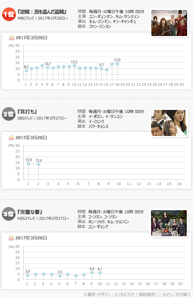 第1話で13.9%をマークしていきなり月火ドラマ1位に立った『耳打ち』は、第2話で0.5ポイントダウンの13.4%となり、『逆賊』に1位の座を奪われた。