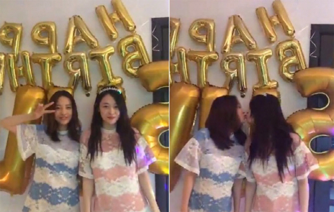 写真を見ると、同じデザインの色違いという「双子コーデ」の2人は、アルファベットをかたどった風船を「HAPPY BIRTHDAY」となるように並べて立っている。