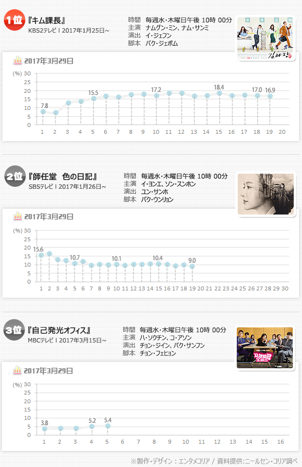 視聴率:ナムグン・ミン主演『キム課長』16.9%、首位キープ 終盤に突入したナムグン・ミン主演のドラマ『キム課長』(KBS第2)が水木ドラマ視聴率1位の座を守っている。 29日に放送された『キム課長』の全国視聴率は16.9%(30日、ニールセン・コリア調べ)を記録した。これは、前回(23日)放送分(17.0%)に比べ0.1ポイントのダウン。 なお、同時間帯に放送された『師任堂 色の日記』(SBS)は9.0%、『自己発光オフィス』(MBC)は5.4%だった。 朝鮮日報日本語版