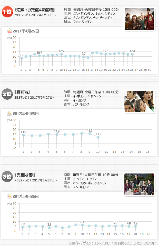 これまで月火ドラマ1位の座を守ってきた『耳打ち』(SBS)は11.9%で、前日の15.5%から3.6ポイントもダウンした。『完璧(かんぺき)な妻』(KBS第2)は4.9%だった。