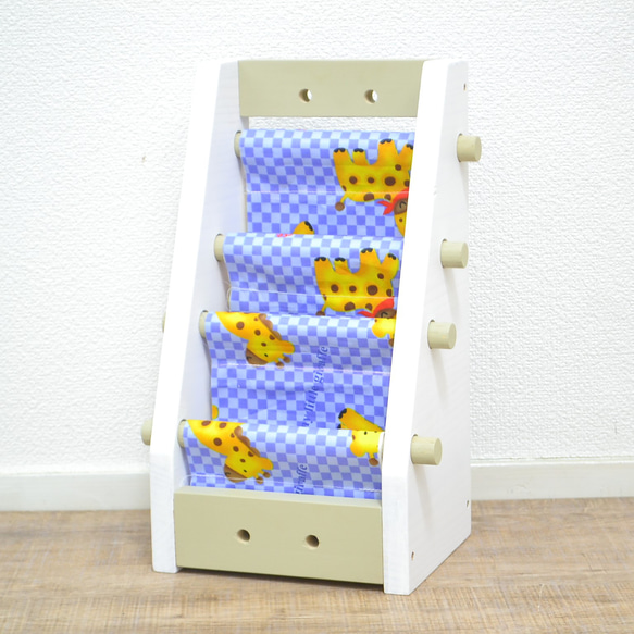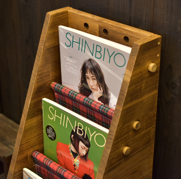 木製で横2列、3段で6冊位の収納が出来、高さの違う丸い横棒