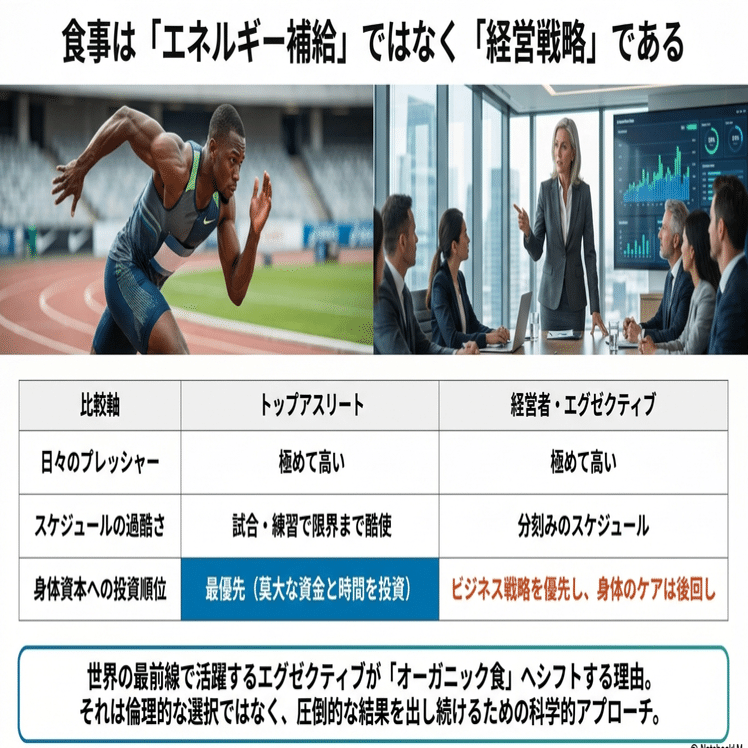 「オーガニック食」は、単なる食の好みの問題や贅沢ではありません。自らの脳と身体のスペックを最大化し、年間数十億、数百億のビジネスを動かし続けるための「最も確実でリターンの大きい戦略的自己投資」です。