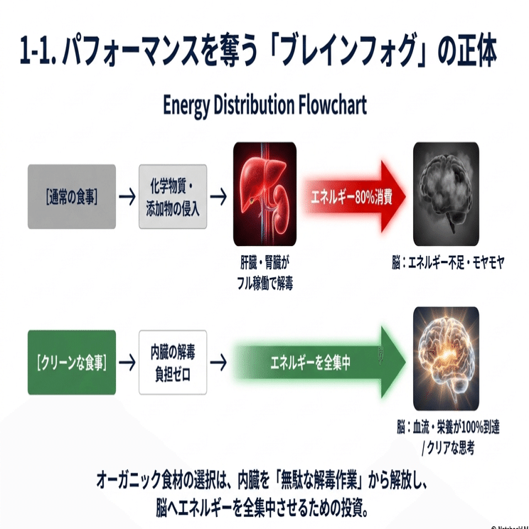 オーガニック(無農薬・無添加)のクリーンな食材を選ぶことは、この「解毒のための無駄なエネルギー消費」から内臓を解放することを意味します。内臓の負担が減ることで、血流や栄養素がしっかりと脳に届き、1日を通してクリアで鋭敏な思考状態を維持することが可能になります。