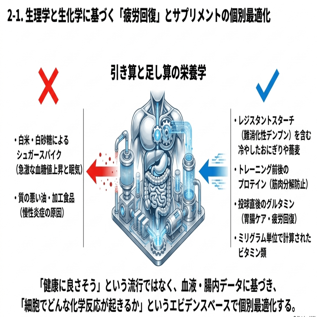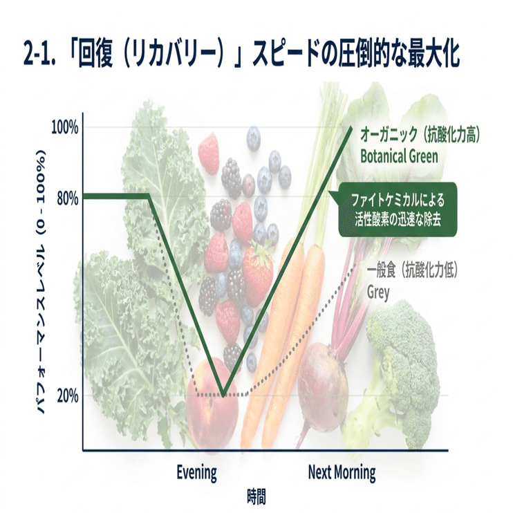 トップアスリートがオーガニック食を選ぶ最大の理由の一つが、「リカバリー(回復)スピードの最大化」です。過酷なトレーニングや試合の後、いかに早く筋肉や神経の疲労を抜き、翌日のパフォーマンスを100%に戻せるかが勝敗を分けます。
