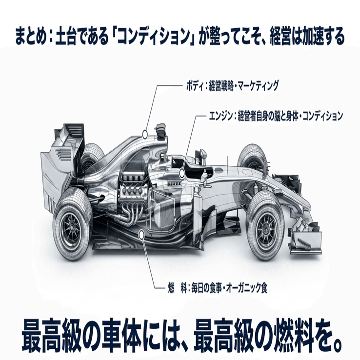 F1マシンに例えるなら、経営戦略やマーケティングが優れた「車体」だとしたら、毎日の食事はエンジンに注ぎ込む「燃料」です。最高級の車体に粗悪な燃料を入れていては、本来のスピードは絶対に出ません。