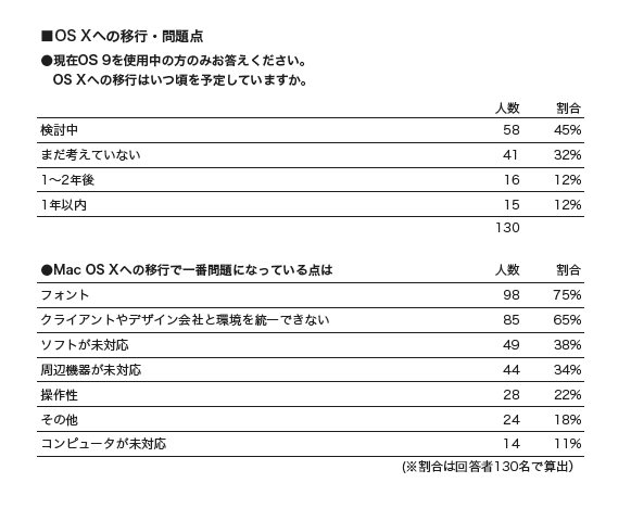 ソフトやハードをよく理解していないような設問のアンケート集計ができあがった。グラフィックデザイナーのパソコン稼働状況を調べて何かの役に立てるという趣旨らしいが、どうもフォントメーカーからの依頼に基づくアンケート臭が香ばしく漂う内容ではあった。世に出てから既に四年を経過しているMac OS Xの使用状況について見てみると、172名中130名がOS XとOS9の併用若しくはOS9で作業をしていて完全に移行しているのは二割弱である。Webの作業だけなら問題は無さそうだが、宣伝ビラや型録などの印刷物をデザインするのには様々な問題があり乗り換えにくいのが実情だ。ハードの方はOS XのエミュレーターとしてしかOS9は起動しなくなっている。いずれは使わざるを得ない状況の中、まだ考えていない人が130名中40名もいる。考えようが考えまいが、現行機種でのOS9は役立たずいっても過言ではない。然るべき時期に移行の準備を模索しないと混乱と出費に拍車が掛かるのではないかと思う。