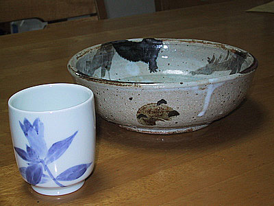 同級生で陶芸家は二人いるが、写真(左)の茶碗は大学で陶芸を教えている同級生から手に入れた物だ。いままで棚に飾っていたのだが、せっかくなので本日より湯呑み茶碗として使ってみよう。