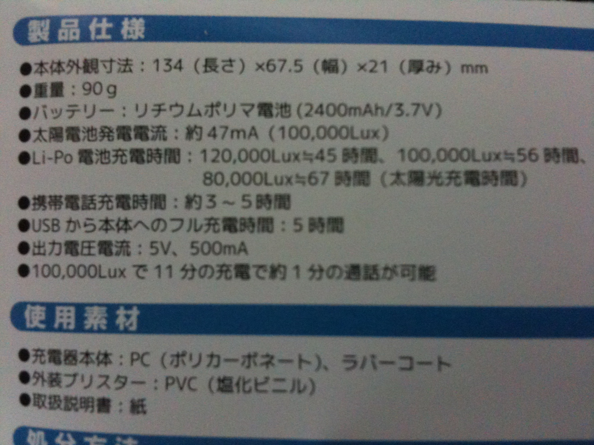 Li-Po電池充電時間:120,000Lux≒45時間、100,000Lux≒56時間、80,000Lux≒67時間(太陽光充電時間)