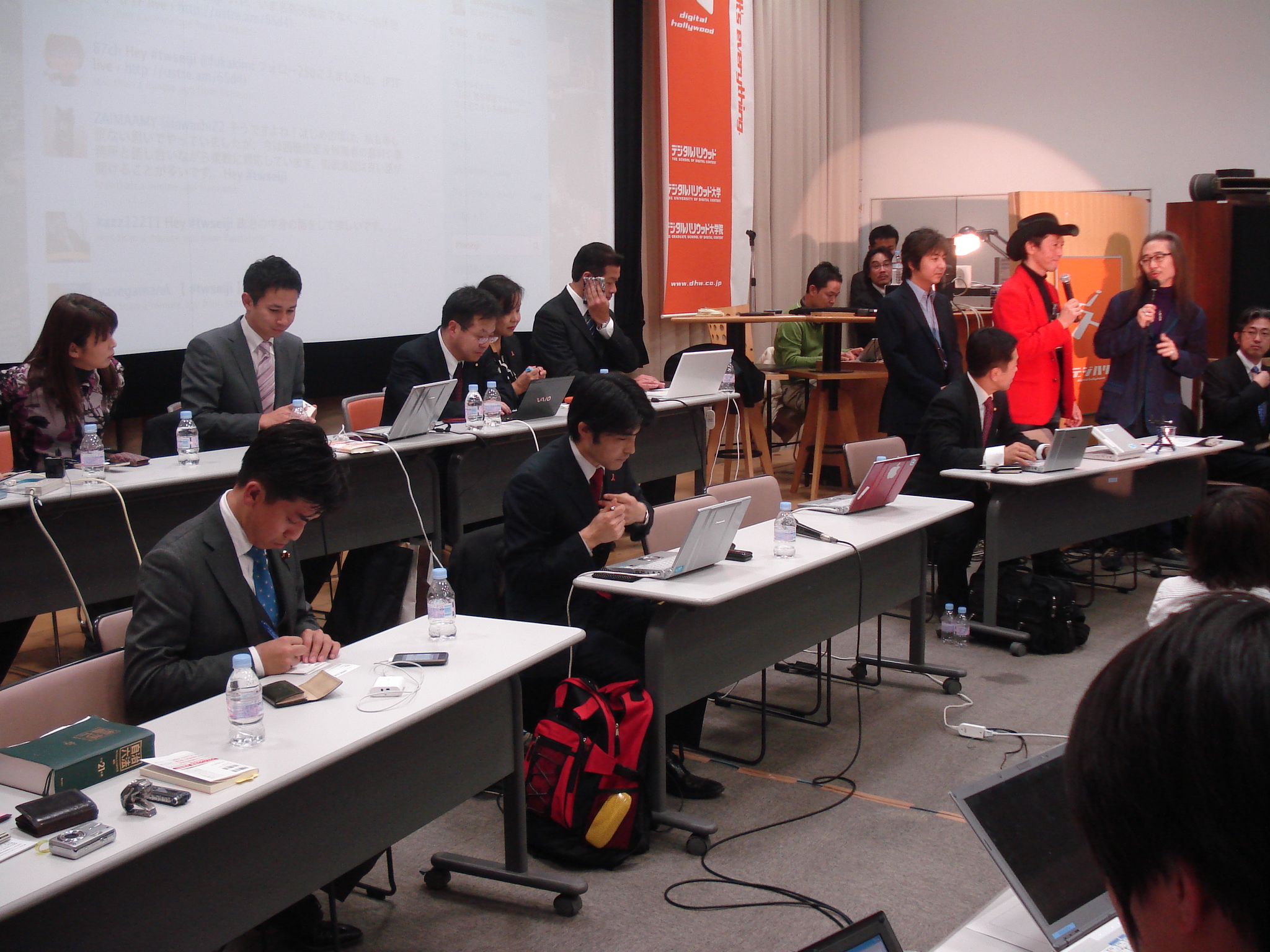2009年12月28日(月)19:00~21:30、デジタルハリウッド東京本校において、「ツイッター議員との今年最後のつぶやき祭り」というイベントを開催し、政治家13名、一般参加者が100名強参加しました。