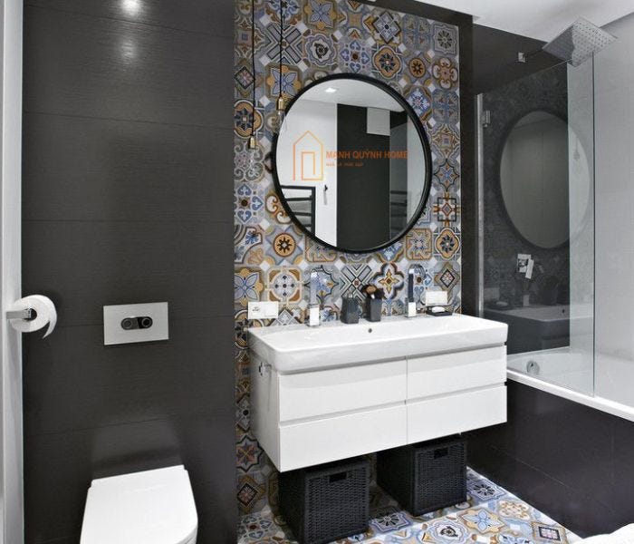 Gạch bông họa tiết cổ điển ốp tường tạo điểm nhấn độc đáo, sinh động và đầy cá tính cho không gian phòng tắm nhỏ.