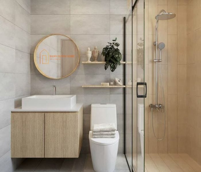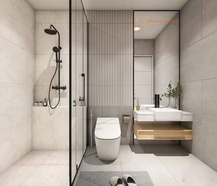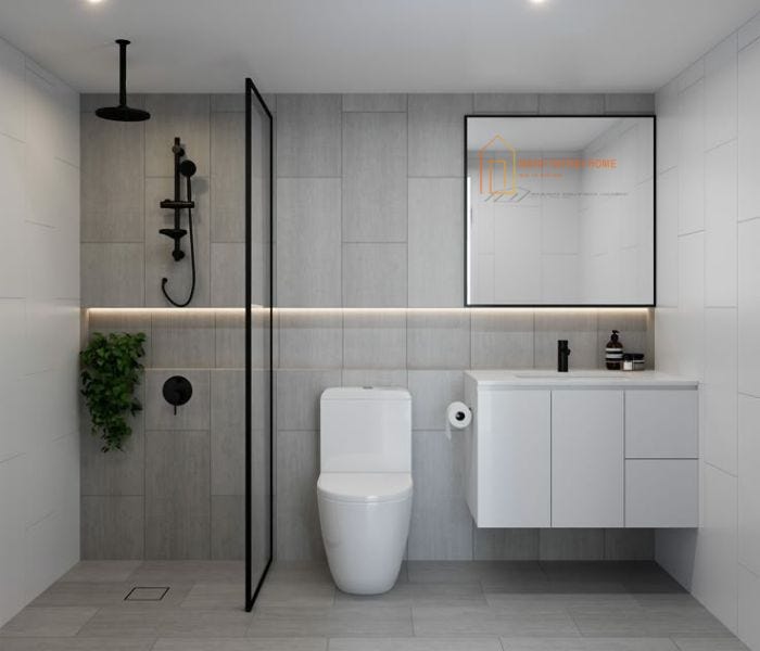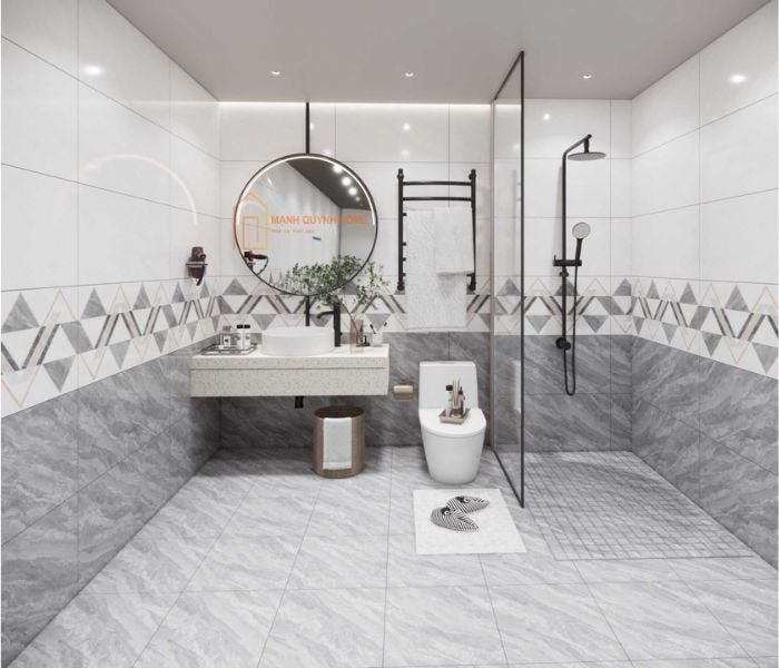 Phòng tắm sử dụng gạch ốp lát 30×60 màu xám nhạt tạo nên không gian thanh lịch và mộc mạc.