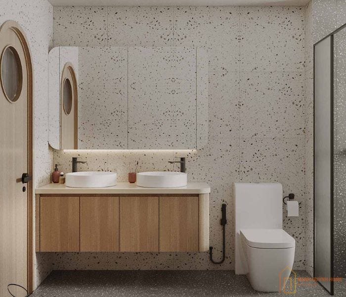 Gạch ốp tường 60×60 họa tiết terrazzo mang vẻ đẹp thanh thoát và sang trọng. Góp phần tạo cảm giác rộng rãi, thoáng đãng và hiện đại cho phòng tắm nhỏ.