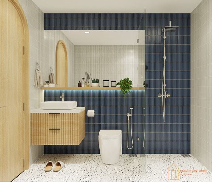 Gạch mosaic dạng thẻ ốp tường màu xanh navy nổi bật và trắng trung tính. Tạo điểm nhấn cá tính và hiện đại cho không gian phòng tắm nhỏ, đồng thời giúp không gian trông cao ráo và gọn gàng hơn.