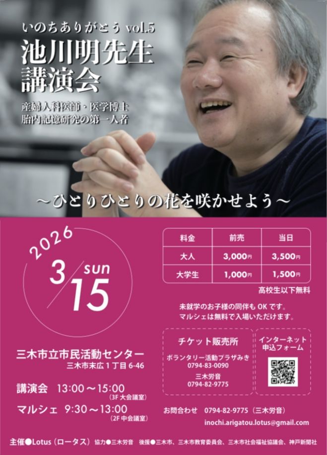 「池川明先生講演会」を三木市市民活動センター3階大会議室で開催いたします。