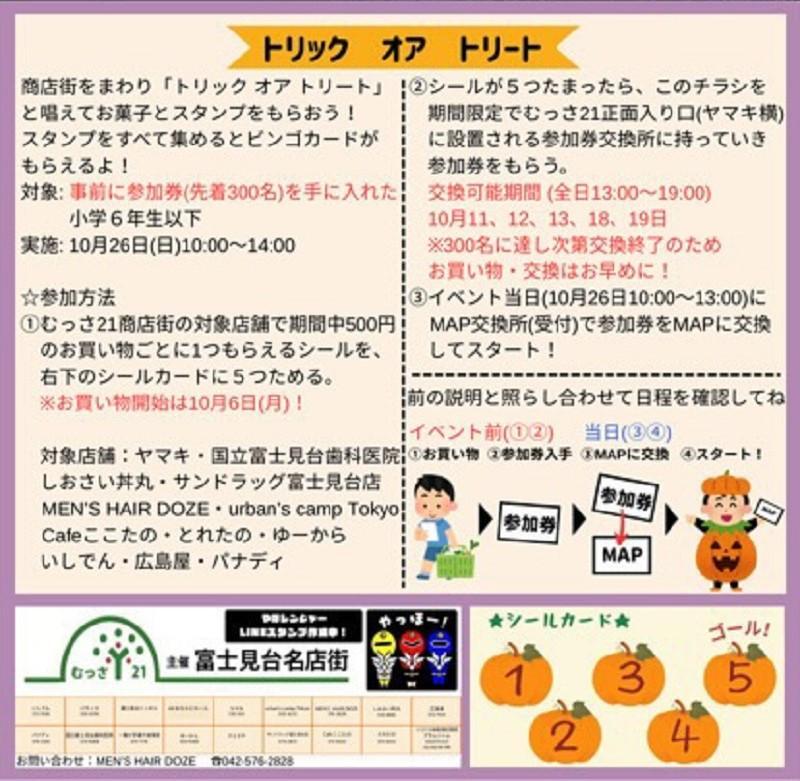 商店街をまわってお菓子がもらえる「トリック オア トリート」への参加は、事前にむっさ21商店街の対象店舗で、期間中500円のお買い物ごとにもらえるシールを5枚集めて「参加券」と交換する必要があります。