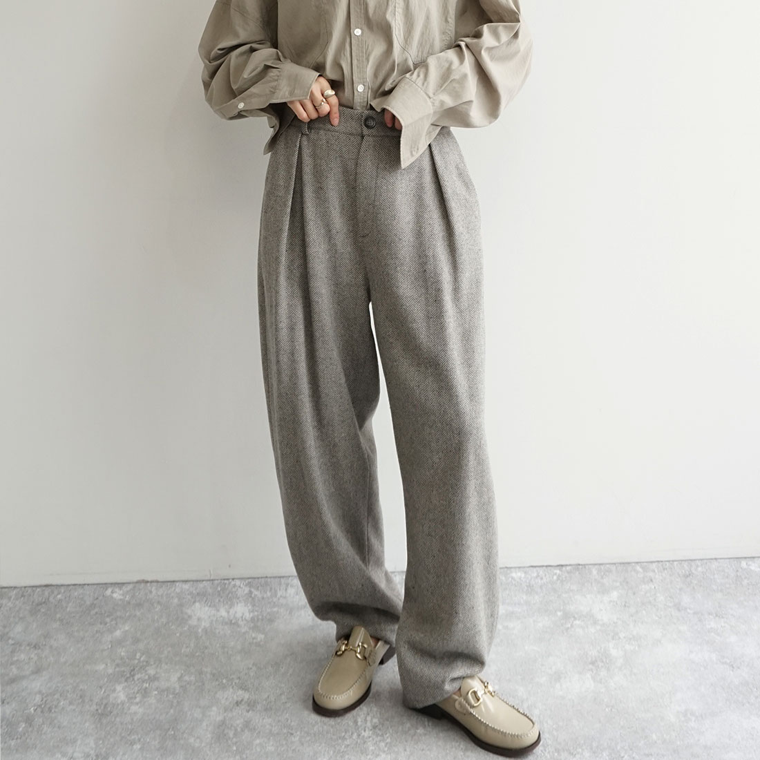 私のイチオシはヘリンボーンのコートと同生地のパンツ!