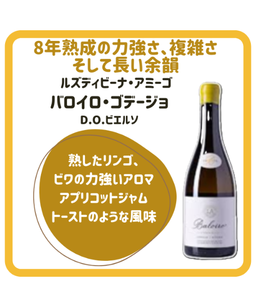 コメント:驚くほどの力強さ、複雑さ、そして長い余韻。熟したリンゴやビワの力強い香りに長い熟成によるアプリコットジャムやトーストのような風味。非常に複雑で豊かな味わいを備え、ゴデージョの優れた熟成ポテンシャルを見事に表現している。