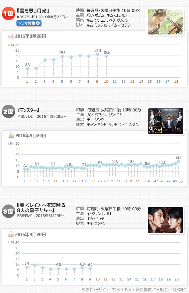 20日に2話連続で放送された『モンスター』のうち、第49話の全国視聴率は12.1%(21日、ニールセン・コリア調べ、以下同じ)、最終回は14.1%で自己最高をマークした。