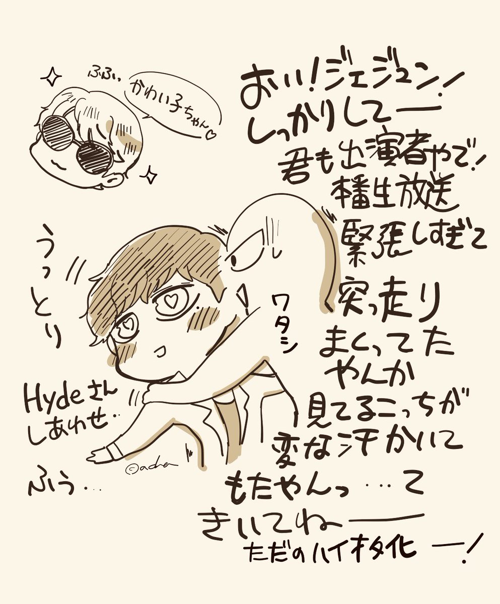 ジェジュンOPトークからhydeさんの話してた笑 プロとしては、歌うことだけを考えないといけないのに、hydeさんの隣に座ってることとか、本当に嬉しくて〜って。VTRとか見ながら、一言でも多く話したいって思ってたんですけど、なかなか話せなくて…でもいいんです!裏で話せたので!って