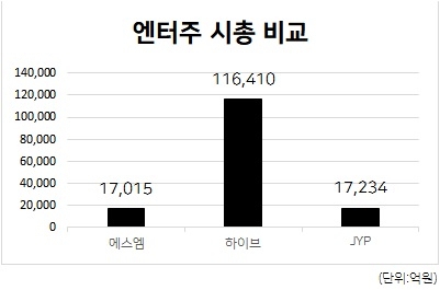 SMの時価総額は約1兆6000億ウォンであるのに対し、競合会社のハイブは11兆7000億ウォンに達する