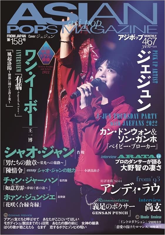 158号の表紙&Pick Up Artistは153号に続いてジェジュン登場! 2年ぶりのファンミの模様を中心に。大好評の「注目の中国ドラマ&俳優」を今号でも大特集。「有翡-Legend of Love-」の7月Blu-ray&DVDリリース記念として主人公・謝允を語るワン・イーボーのインタビューを掲載。裏表紙も「有翡~」が飾る。また、大好評放送中のワン・イーボー主演のサスペンス時代劇「風起洛陽~神都に翔ける蒼き炎~」の続報グラビア中心に。大人気のシャオ・ジャンは、この夏日本初放送となる「男たちの勲章~栄光への旅路~」の紹介と、好評放送中の吹替版&秋より字幕版も放送スタートの「陳情令」から、エッセイ「シャオ・ジャンの魅力」(by小酒真由子)を掲載。他には「山河令」で人気沸騰中のチャン・ジャーハン主演「如意芳霏(にょいほうひ)~夢紡ぐ恋の道~」、若手注目俳優ホァン・ジュンジエ主演の「花咲く合縁奇縁」を紹介。好評連載中のプロのダンサーでユーチューバーのARATAが語る「大野智の凄さ」No14は、“夜の影"と“Crazy Moon~キミ・ハ・ムテキ"について。アンディ・ラウの“from '93"はNo.44。推薦映画はフィリピンの巨匠ブリランテ・メンドーサ監督の『義足のボクサー GENSAN PUNCH』。主演の尚玄のインタビューを掲載。他に是枝裕和監督の『ベイビー・ブローカー』主演ソン・ガンホ&カン・ドンウォンのカンヌ映画祭での模様もピックアップ。映画レビューはホン・サンス監督の『イントロダクション』(宇田川幸洋)と『恋愛の抜けたロマンス』(暉峻創三)等、充実の内容。