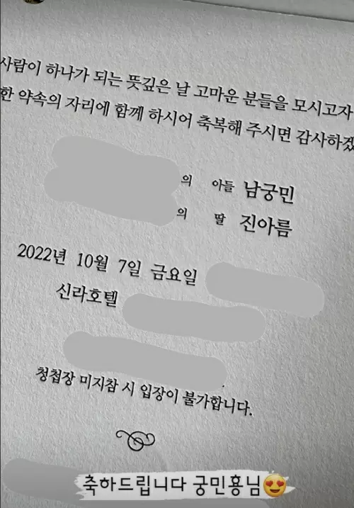 公開された写真は、2人の結婚式の招待状だ。招待状には「2人がひとつになる意味深い日にありがたい方々をお迎えしたいと思います。約束の席を共にして祝福してくださればありがたいです」と書かれており、「2022年10月7日新羅ホテル」等の字がきれいに書かれている。