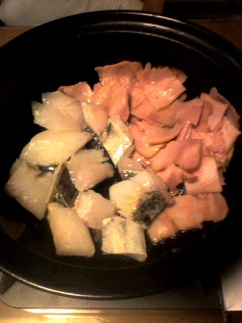 ?オリーブオイルを熱した土鍋にベーコンを、脂が出てきたらタラを入れて軽く焼く。