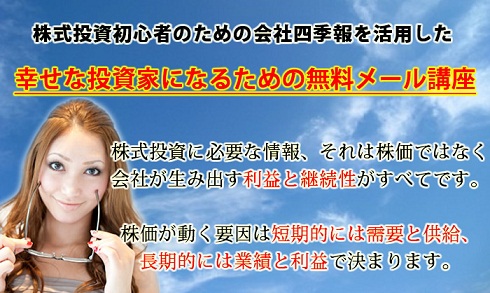 幸せな投資家になるための無料メール講座 ■初心者が株で失敗する原因とは? ⇒ 幸せな投資家になるための無料メール講座 株式投資初心者のための会社四季報を活用した、 幸せな投資家になるための無料メール講座。 資産11万円を会社四季報を使い1000万円にまで増やし 雑誌BIGtomorrowにも紹介された投資家のノウハウ。 全部で50の投資情報をA4レポート92枚分の 無料メール講座を、登録されたすべての方にプレゼント! 今すぐご登録を! ■この一冊があなたの資産運用を成功へと導きます! ⇒ 幸せな投資家になるための無料メール講座 ↓ 詳細を見る ↓