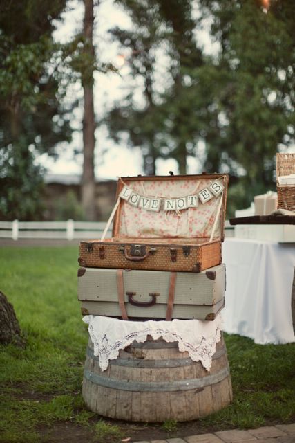 アンティークのトランクケースをいくつか並べて床に置いて、その上にお花を置いたり、