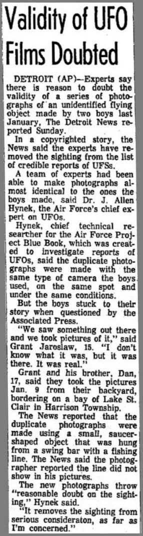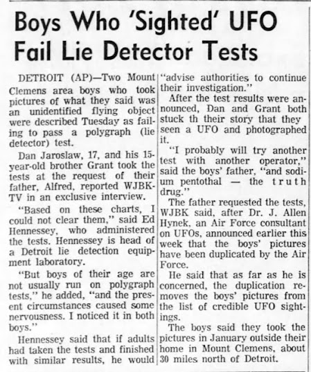 Alfred Jaroslaw, the boys’ father, was incensed at the hoax allegation (and the ribbing he was getting from friends). “This casts a lot of doubt on my boys and I'm convinced they photographed what they said they saw. No models were involved. I'm out to prove it was genuine.” He accused the Air Force of “covering up the truth about saucers” by casting aspersions on his sons. He requested a lie detector test for the boys. Further details were in the AP story below, including the father saying of the failed polygraph, "I probably will try another, and sodium pentothal — the truth drug.”