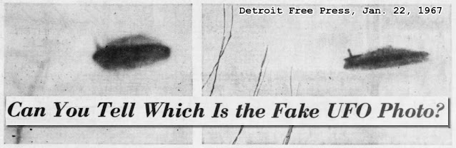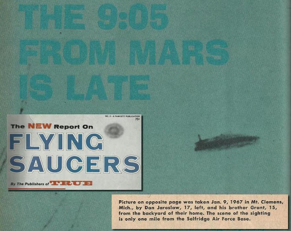 In True, Maj. Hector Quintanilla, told Fink that the Air Force "doesn't like to openly call anything a hoax." Comparing the Jaroslaw and Nyls photos, he said, "We found the two pictures similar. If we had an original Jaroslaw photo I think we could have told the size exactly, but, using The Detroit News blowups, we were only able to tell that the object was about four inches long, with a plus or minus error factor of a couple of inches." As an aside, he said “We've thrown up lampshades and ‘frisbees’ and taken some wild pictures with the [Polaroid] Swinger. I was really surprised.” It made great saucer photos – at least great phony ones.