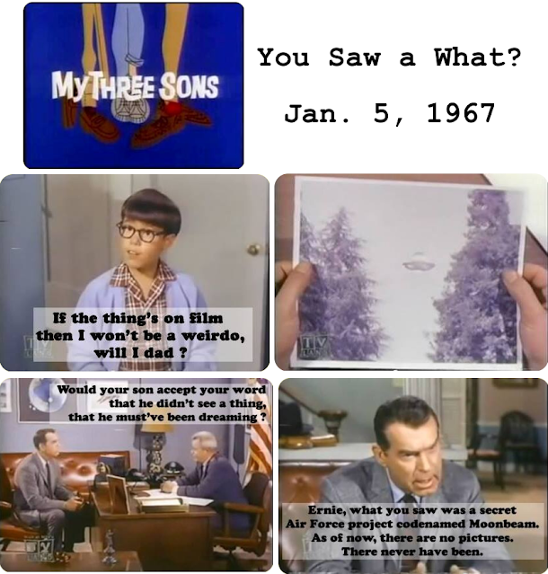 It was suggested that the Jaroslaw brothers were copycats, inspired by a television show. In My Three Sons, January 5, 1967, "You Saw a What?," Ernie saw a flying saucer, but no one believed him. He goes back and manages to photograph it, then his father, Steve Douglas took the photos to the Air Force. General Carstairs told him that what the boy saw was a test flight of Project Moonbeam, and that it must be kept secret for national security. After being persuaded to lie for his country, Ernie had to be interviewed by a smug reporter on live television to protect the cover-up. Later, he’s made fun of at school. The show may not have had any influence on the boys, but it may have prompted Mrs. Jaroslaw’s fear the Air Force would take and hide the photos.