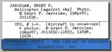 For whatever reason, the Polaroid pictures were copyrighted in the name of Grant P. Jaroslaw, dated April 19, 1967, as “Helicopter [against sky],” and “UFO # 1 – 4 [Aircraft in snowscape.]”