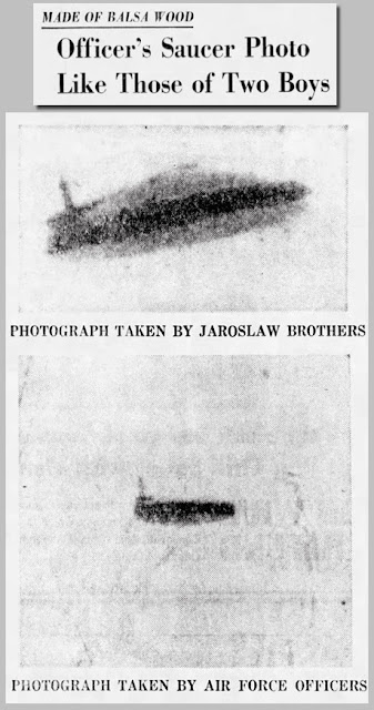 "Officer's Saucer Photo Like Those of Two Boys" by Jack Jones was essentially on the Air Force closing the case. It showed a comparison of the Jaroslaw saucer photo to that of Maj. Nyls and said, “Blue Book officials here were careful not to use any words like 'hoax' or 'fake' in talking about the boys' pictures. They said they were unable to reach any conclusions about the case because of the unavailability of the original pictures for analysis. In the course of his investigation, Nyls tried to duplicate the setup of the boys’ pictures in order to aid in the photo interpretation."