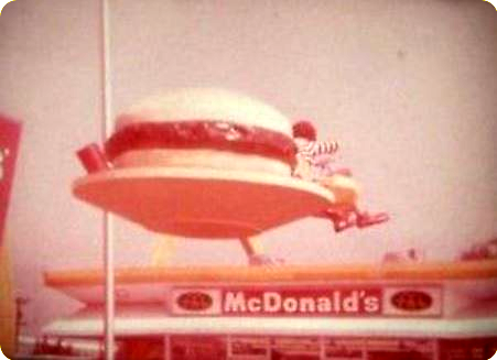 1967年、ハンバーガーショップ「マクドナルド」のコマーシャルで、ドナルド・マクドナルドに「空飛ぶハンバーガー」を持たせたところ、後部に目立つ排気管が突き出ていたのである。企業の流用なのか、それとも偶然なのか。