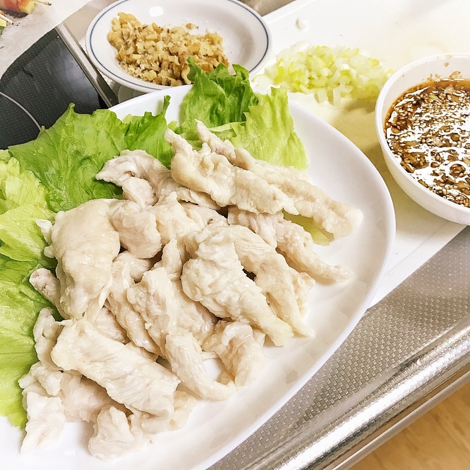 鶏胸肉じゃなく、ササミにしたので、多めの酒、マヨネーズ、につけて、片栗粉も入れてから茹でました♪つるんシットリ❤️