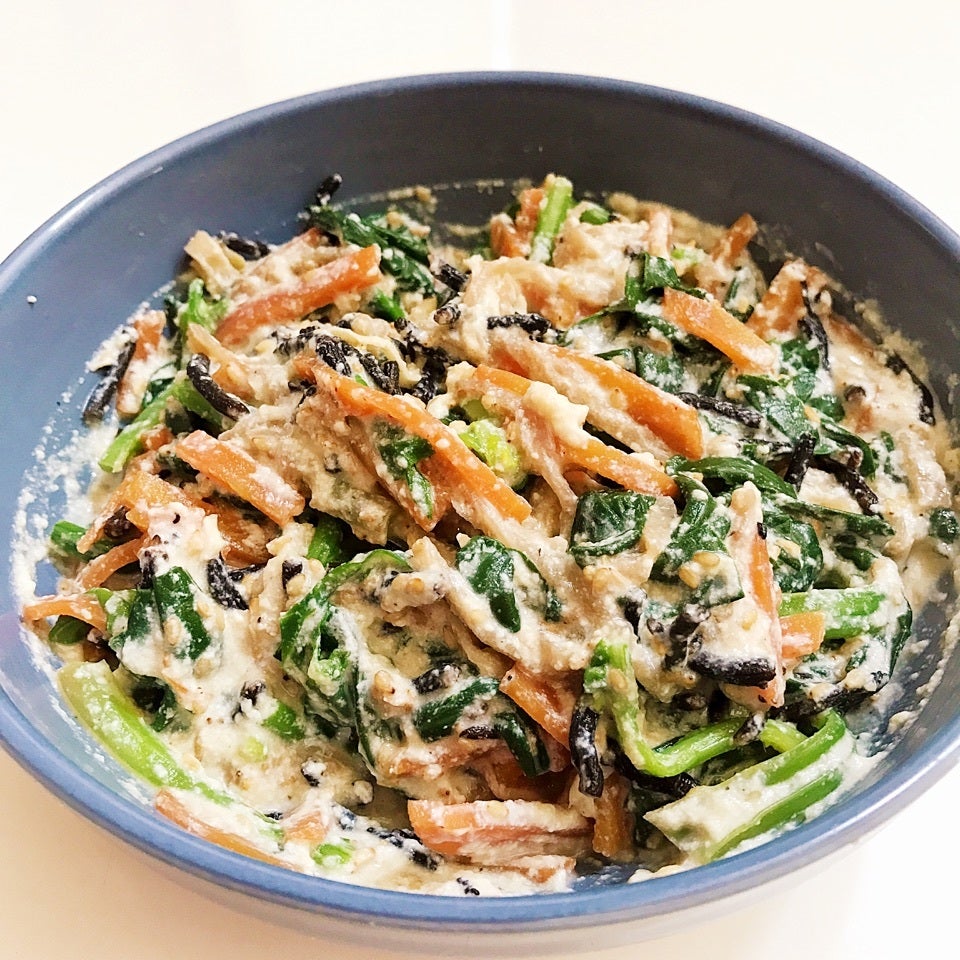ひじき、切り干し大根、人参を麺つゆで煮て、別茹でしたほうれん草と胡麻を入れました(*´˘`*)♡