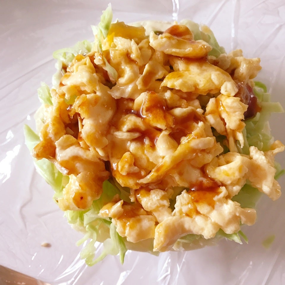 パンにマヨネーズ塗って、千切りキャベツ→マヨネーズ→炒り卵(少し半熟)→照り焼きソース→